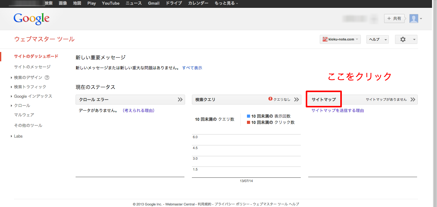 上で登録をしたサイトのウェブマスターツールの表題をクリックするとウェブマスタツールの初期画面に移ります。