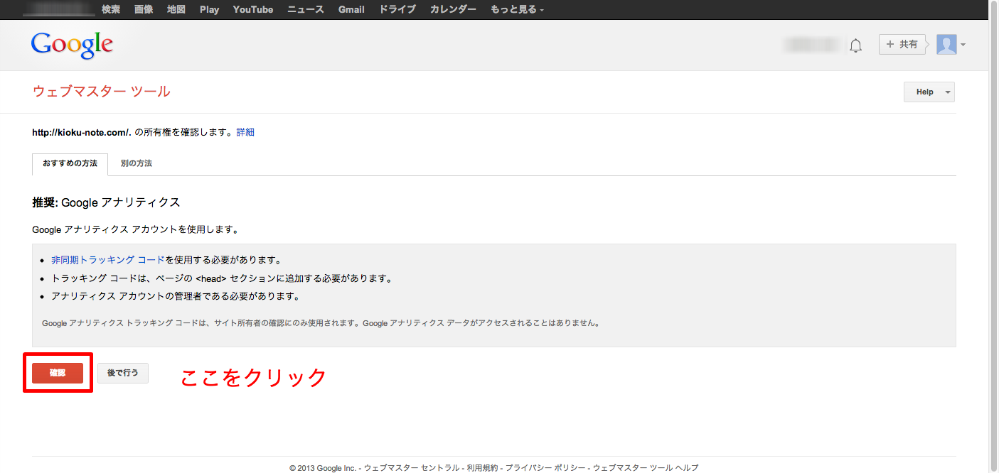 Google アナリティクスに登録している場合は下記の画面で確認をクリックすれば完了です。